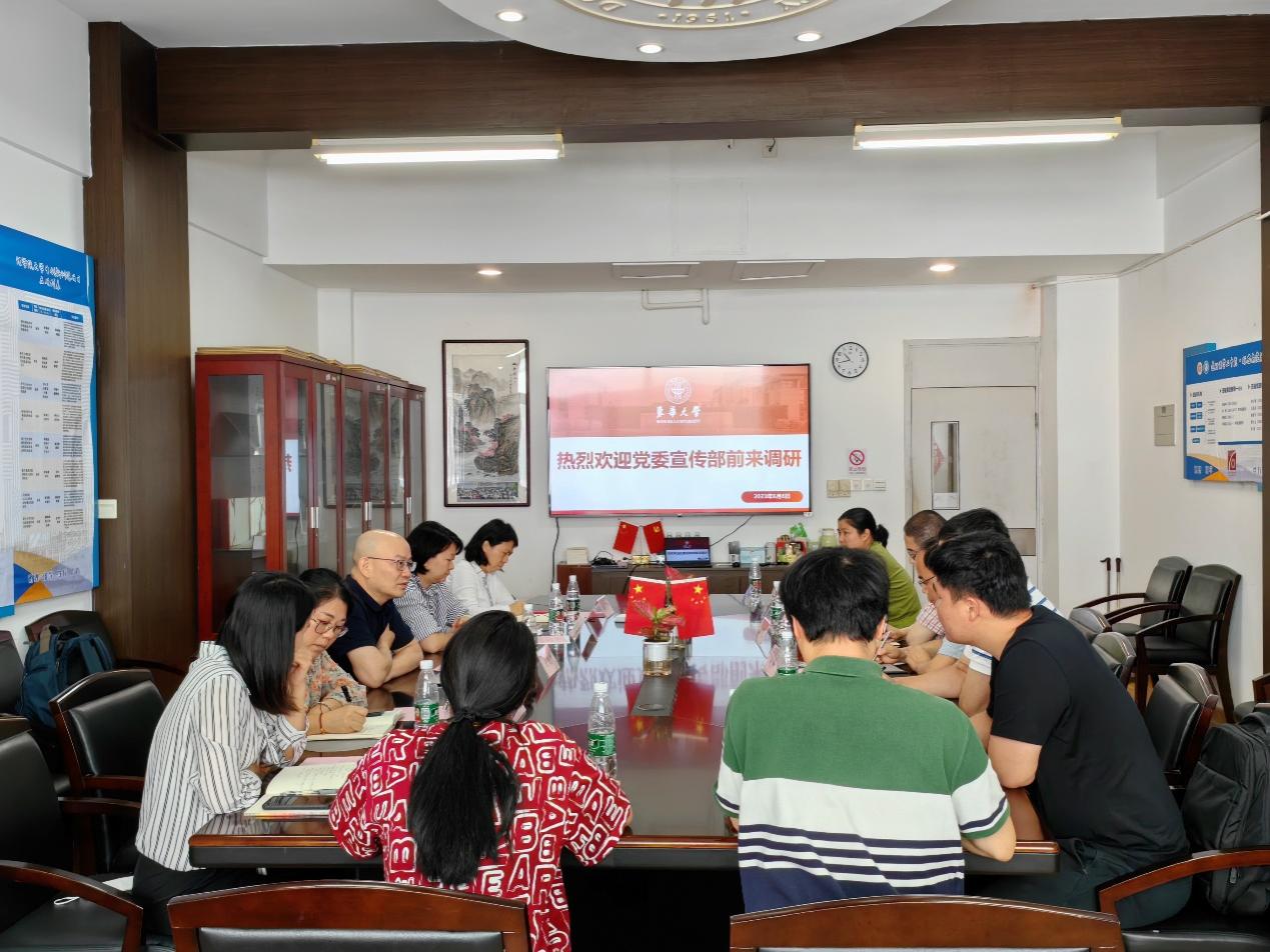 6月8日上午,校党委常委、宣传部部长任晓杰、副部长虞晨洁、副部长向娟、副部长孙庆华,党委宣传部副主任科员朱一超一行五人来我院调研学校宣传思想工作状况。理学院党委副书记(主持工作)谢峰、副书记王乔松、副院长唐晓亮、辅导员代表及学院宣传工作相关负责人参加调研座谈会。会议围绕校院两级在培养时代新人、提升思政教育成效,增强校园文化建设引领力等七个方面主题展开。