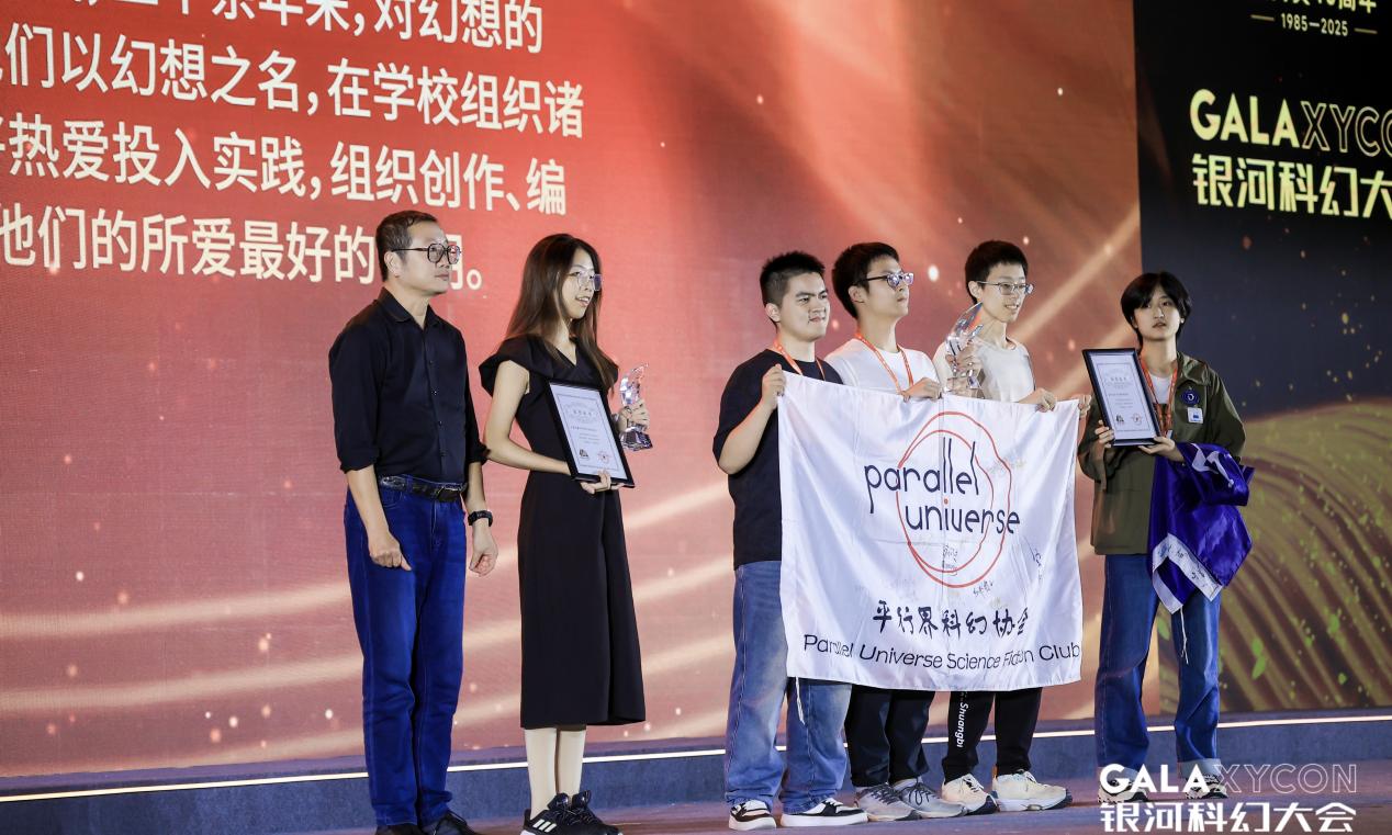 平行界科幻协会自成立以来,始终坚持以“激发想象、连接未来”为宗旨,积极组织科普活动、主题沙龙、科幻观影、作家讲座等活动,已逐步成长为上海地区具有影响力的高校科幻社团之一。银河奖系我国科幻界权威性和影响力的奖项之一,自1985年设立以来,始终致力于推动中国科幻文学的发展。颁奖典礼上,获奖学生代表从中国知名科幻作家刘慈欣手中接过奖杯。会议期间,他们还参加了由银河奖组委会主办的全国高校科幻社团联谊沙龙,与来自武汉大学、华南理工大学、哈尔滨工业大学等高校科幻社团代表深入交流,围绕社团运营、科幻创作孵化、校际合作等议题展开讨论。